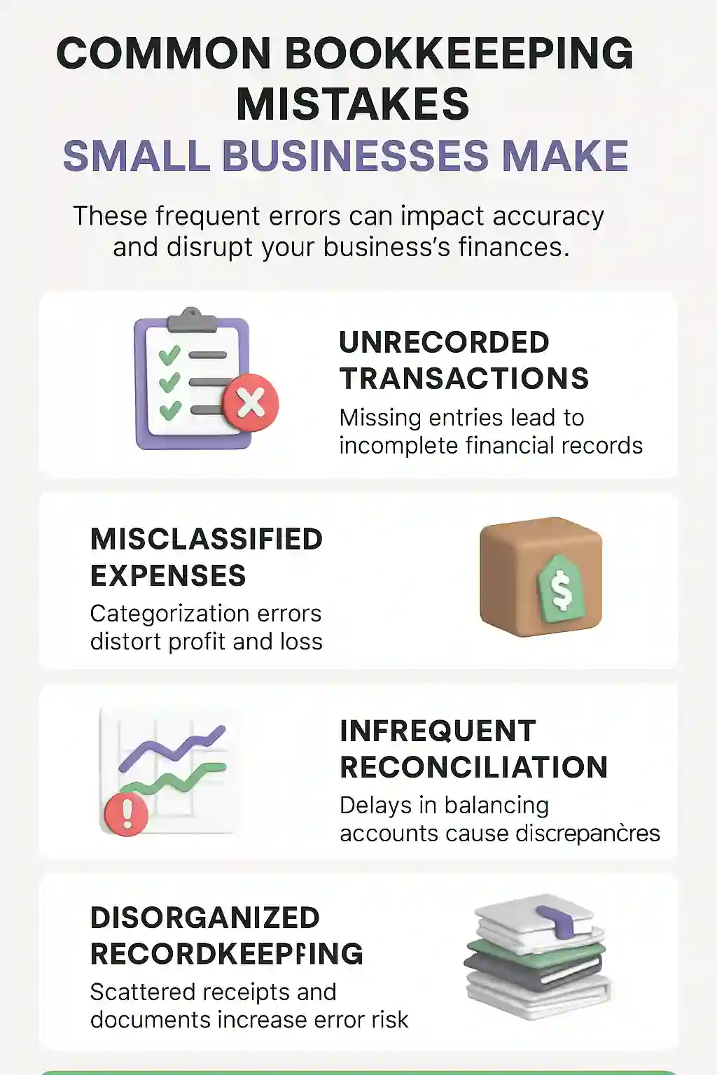 - Misclassified expenses and unreconciled accounts are the most common errors.